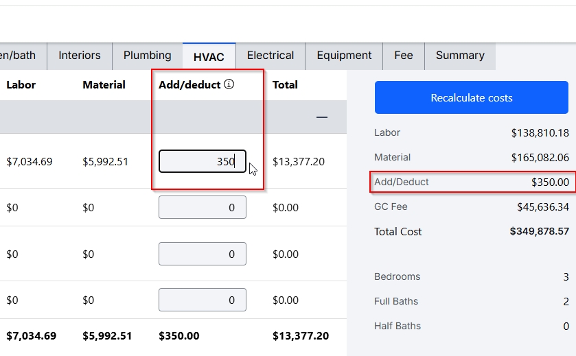 Instant™ provides you the power to edit the calculated costs in the software using the “Add/Deduct” field. This feature allows you to delete labor costs to reflect “sweat-equity” for any given line item or to modify the cost of an item up or down to reflect your bid price. Home-Cost.com puts you in control of estimate results for any line item. Just navigate to any line item and in the “Add/Deduct” field add a positive number to increase cost, or a negative number to decrease cost for that particular item.