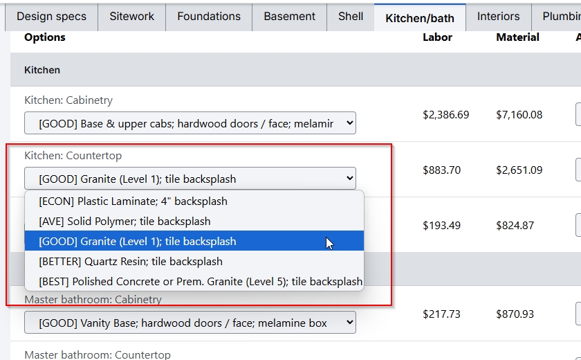 Instant™ provides the broadest range of design and material options in the market. Each of the building systems in our software has a deep bench of options from which to choose. For example, Sitework includes clearing and grading, roads and driveways, landscaping, site utilities, etc. Exterior wall options include wood studs, metal framing or concrete block. Siding options include vinyl, cement fiber, metal siding, brick, stucco, and stone veneer. Kitchen and bath countertops include laminate, solid polymer, quartz resin, granite, and soapstone. Even the equipment section includes elevators and appliances ranging from economy to commercial quality levels.