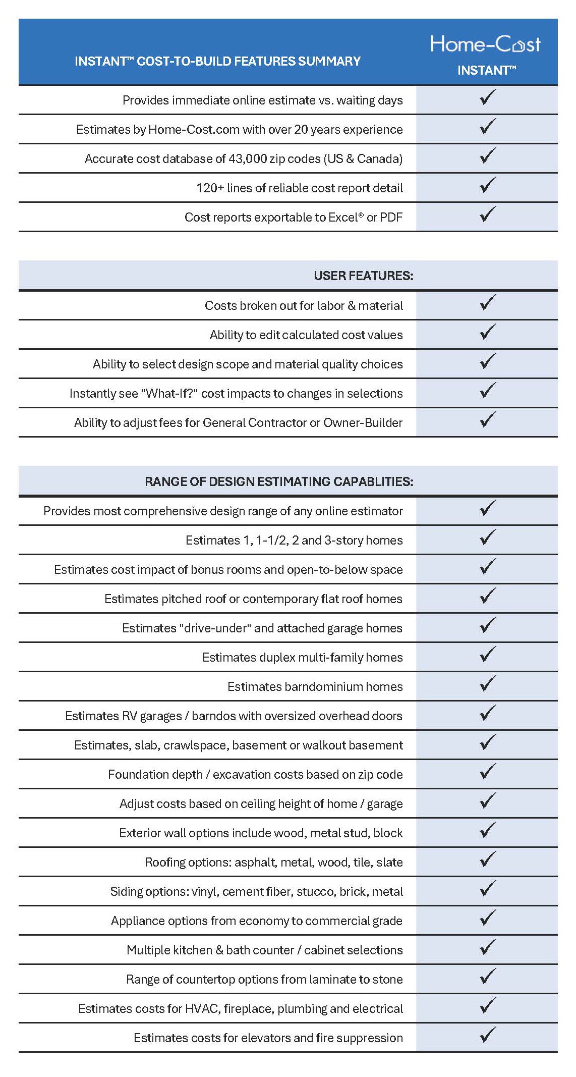 This latest release of our groundbreaking INSTANT™ cost-to-build software is designed to quickly and accurately estimate home design plans and early stage design concepts. Estimate 1, 2 and 3-story homes and a broad variety of home design styles. With INSTANT you get fast, easy and accurate construction cost estimates that save you time and money. INSTANT is sold in either a “Standard” or “Unlocked” license type.